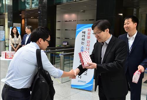권오준 포스코 회장, 간식 나눠주며 직원 격려