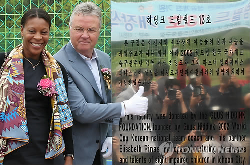 | △ '히딩크 드림필드'에 선 히딩크 감독 (이천=연합뉴스) 신영근 기자 = 8일 오후 경기도 이천시 관고동 설봉공원에서 시각장애인 축구장 '히딩크 드림필드' 13호 개장식이 열려 거스 히딩크 전 축구 국가대표팀 감독이 엄지손가락을 세워보이며 개장을 축하하고 있다. 2015.5.8 drops@yna.co.kr |