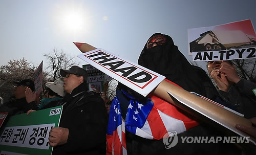 | △ 미국 하원 국방위는 사드의 한반도 배치는 한미 양국에 상호이익이 될 것이라고 밝혔다. 사진은 지난달 10일 시민단체 회원들이 사드의 한반도 배치 반대하는 집회를 하는 모습. (연합뉴스 사진자료) |