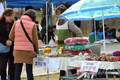 | △ 평화동 주민들이 꾸민 '평화마을장터' (전주=연합뉴스) 김진방 기자 = 전북 전주 학산종합사회복지관은 9일 오전 11시부터 오후 5시까지 전주시 완산구 평화동 신성공원에서 평화동 주민들의 마을문화시장 프로젝트인 '평화마을장터'를 연다. 평화마을장터는 2013년부터 시작해 매월 둘째주 토요일 마을 주민들이 그룹 작업을 통해 만든 공예품과 먹을거리 등을 전시하고 판매하는 문화 프로그램이다.2015.5.9 chinakim@yna.co.kr |