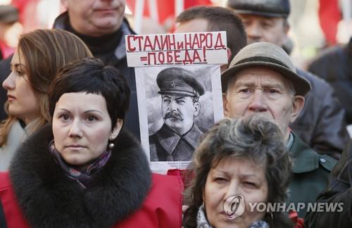 | △ (epa=연합뉴스) 지난달 22일 러시아 모스크바에서 열린 한 행사에서 러시아 공산당원들이 스탈린의 초상화를 들고 있다. |