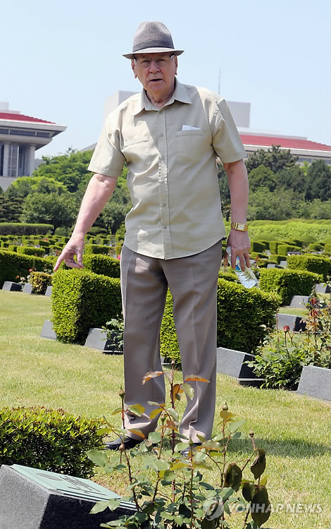 | △ (부산=연합뉴스) 조정호 기자 = 6·25전쟁 때 영국군으로 참전한 제임스 그룬디(83) 씨가 부산시 남구 유엔기념공원을 찾아 묘지를 둘러보고 있다. 27년간 자비로 매년 부산을 찾은 그룬디 씨는 말기암환자로 이번이 마지막 방문이다. 2015.5.9 ccho@yna.co.kr |