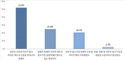 반면 20.7%는 "선진국 중소기업 경쟁력 수준과 거리가 매우 가까워졌다", 2.3%는 "독일·일본 등 선진국 중소기업과 대등한 수준"이라고 답했다.