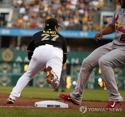 | △ (피츠버그 AP=연합뉴스) 10일(한국시간) 미국 펜실베이니아주 피츠버그 PNC파크에서 열린 세인트루이스 카디널스와의 홈 경기에 3루수로 선발 출전한 강정호(왼쪽)가 2회초 수비 때 닐 워커의 송구를 받아 3루를 밟고, 다시 2루쪽을 바라보고 있다. 강정호의 송구로 트리플 플레이가 완성됐다. 2루수-3루수-2루수로 이어진 트리플 플레이는 메이저리그 역사 상 처음 나온 진기록이다. |