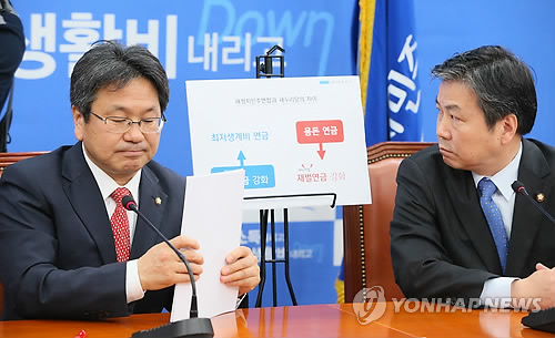 | △ 소득대체율 50% 진실은? (서울=연합뉴스) 진성철 기자 = 새정치민주연합 강기정 공무원연금개혁특위 야당 간사(왼쪽)와 홍종학 의원이 8일 국회에서 열린 '세대간 도적질 및 소득대체율 50% 진실 간담회'에서 굳은 표정을 짓고 있다. 2015.5.8 zjin@yna.co.kr |