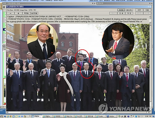 | △ 러시아의 제2차 세계대전 전승절 행사에 참석한 새누리당 윤상현 의원이 9일(현지시간) 북한의 김영남 최고인민회의 상임위원장을 만나 주목된다. 대통령 특사 자격으로 러시아 전승 행사에 참석한 윤 의원(대통령 정무특보)은 붉은광장에서 펼쳐진 군사퍼레이드 이후 인근 무명용사의 묘에 헌화하는 과정에서 김 상임위원장과 약 5차례 걸쳐 얘기를 나눈 것으로 전해졌다. 사진은 신화통신이 10일 보도한 단체사진 속 남북 대표. |