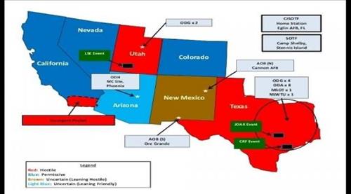 이들 가운데 텍사스와 유타 주는 '적색'으로, 뉴멕시코를 제외한 나머지 주들은 '청색'으로 표시된 훈련지도가 공개된 게 발단이 됐다.