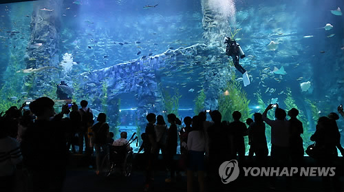 | △ 10일 오후 서울 송파구 잠실동 제2롯데월드 아쿠아리움을 찾은 시민들이 아쿠아리움을 둘러보고 있다. 제2롯데월드 운영사인 롯데물산은 12일께로 예정된 아쿠아리움(수족관)·시네마(영화관) 재개장에 앞서 사흘간 지역주민과 시민 3만6천여명을 초청해 무료 관람 행사를 진행하고 있다. |