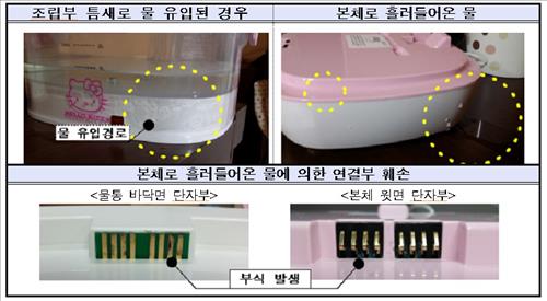 소비자원은 소비자위해감시시스템(CISS)에 신고가 접수돼 조사한 결과, 해당 제품의 물통을 분리해 씻거나 물에 담그는 과정에서 조립부 밑면 틈새로 들어간 물이 본체 윗면 단자부 등으로 흘러들어 가면 부식이나 작동 불량 등을 일으킬 가능성이 있는 것으로 확인됐다고 설명했다.