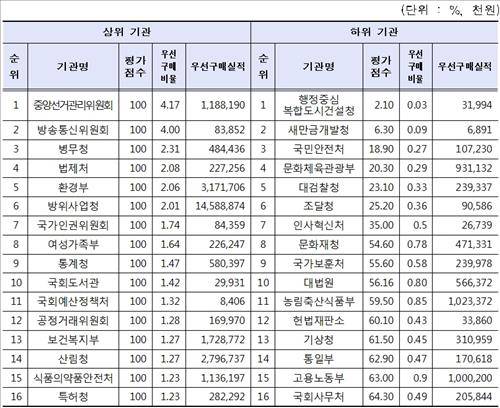 반면 중앙선거관리위원회, 방송통신위원회, 병무청, 법제처, 환경부 등은 100점 만점을 받았다.