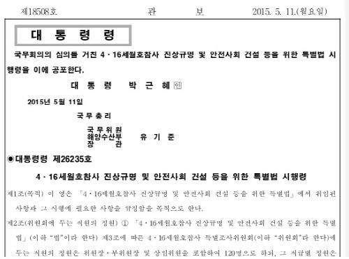 (세종=연합뉴스) 성혜미 기자 = 지난 6일 국무회의에서 의결된 '4·16세월호참사 진상규명 및 안전사회건설 등을 위한 특별법 시행령(대통령령)'이 박근혜 대통령의 재가를 거쳐 11일 공포됐다.
