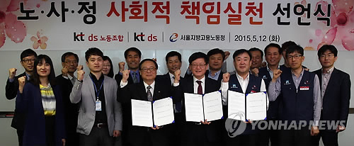 (서울=연합뉴스) 한지훈 기자 = KT[030200]의 IT서비스 계열사인 KT DS 노사가 12일 서울지방고용노동청과 함께 사회적 책임을 실천하겠다는 내용의 노사정 공동선언문을 채택했다.
