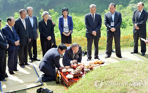| △ 성묘하는 반기문 유엔 사무총장 (음성=연합뉴스) 2013년 8월 25일 고향인 충북 음성군 행치마을 방문해 성묘를 한 반기문 유엔 사무총장과 부인 유순택 여사, <연합뉴스 DB>> |