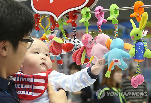 | △ 장난감이 신기해 (서울=연합뉴스) 양지웅 기자 = 7일 오후 서울 서초구 양재동 aT센터에서 열린 '제10회 서울 베이비 키즈 페어'에서 한 아기가 장난감을 만지고 있다. 2015.5.7 yangdoo@yna.co.kr |