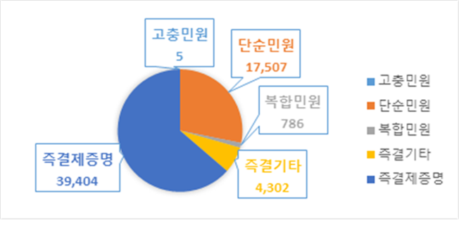 2023년 3월 고양시에 접수된 민원은 총 62,004건으로, 즉결제증명 39,404건, 단순민원 17,507건, 복합민원 786건, 즉결기타 4,302건, 고충민원은 5건으로 집계됐다.