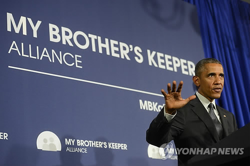 | △ (뉴욕 AP/더 데일리 뉴스=연합뉴스) 볼티모어 흑인청년 사망에 따른 폭동사태로 흑인 젊은이들의 열악한 교육과 빈곤에 대한 미국사회의 관심이 재부각된 가운데 버락 오바마 대통령이 지난 4일(현지시간) '내 형제의 보호자'(My Brother's Keeper) 프로그램 강화계획을 발표했다. 사진은 오바마 대통령이 이날 뉴욕주 리먼컬리지의 독립적 비영리단체 '내 형제의 보호자 연합' 창설 행사에서 연설하는 모습. 2015.5.4 (Susan Watts/The Daily News via AP, Pool) |