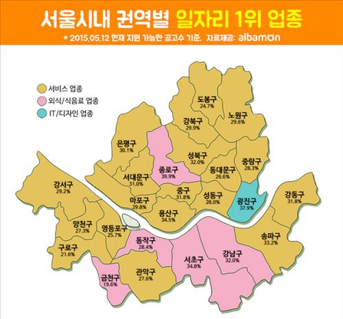 25개 구 가운데 용산구(34.5%), 송파구(33.2%), 성북구(32.0%) 등 19개 구에서 서비스직 아르바이트 공고가 가장 많았다. 종로구(39.9%), 서초구(34.8%), 강남구(32.0%) 등 5개 구에서는 외식·식음료 업종의 아르바이트가 강세를 보였다.