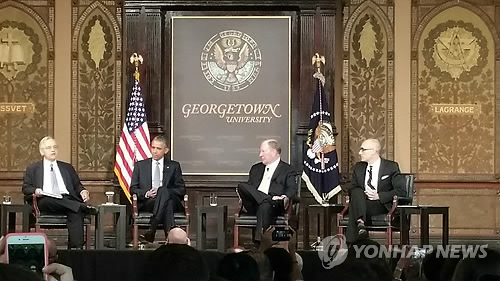 (워싱턴=연합뉴스) 심인성 특파원 = 버락 오바마 미국 대통령이 12일(현지시간) 한 외부 세미나에 패널로 참석했다.