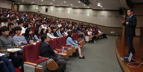 | △ 조규형 재외동포재단 이사장은 13일 오후 인하대학교 하이테크센터 대강당에서 340명의 학생을 대상으로 재외동포 이해 교육을 펼쳤다. |
