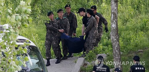 | △ 들 것에 실린 총기 난사 예비군 (서울=연합뉴스) 한종찬 기자 = 13일 오전 예비군 사격훈련중 총기 사망사고가 발생한 예비군 훈련장에서 군 관계자들이 총기를 난사하고 자살한 최모씨의 시신을 들고 이동하고 있다. |