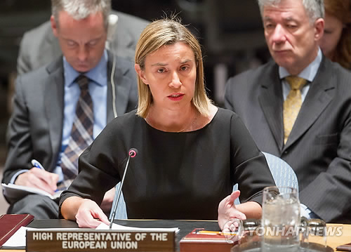 | △ EU, 지중해 난민선 군사작전 필요성 강조 (뉴욕 AP=연합뉴스) 페데리카 모게니리 유럽연합(EU) 외교안보 고위대표가 11일(현지시간) 미국 뉴욕 유엔본부의 안전보장이사회(안보리)에서 발언하고 있다. 모게리니 대표는 지중해 난민들의 참사 방지를 위한 군사작전 계획에 대해 "난민선을 폭격하는 방안은 아무도 생각하지 않고 있다"며 "군사작전은 바다에서만 이뤄질 것"이라고 강조했다. |