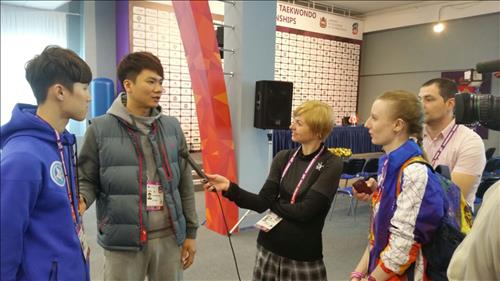 | △ (첼랴빈스크<러시아>=연합뉴스) 배진남 기자 = 2008년 베이징올림픽 태권도 금메달리스트인 차동민(왼쪽에서 두 번째)이 소속팀의 전력분석 요원으로 2015 세계태권도선수권대회가 열리는 러시아 첼랴빈스크를 찾았다. 소속팀 후배 차태문(맨 왼쪽)과 함께 13일(현지시간) 첼랴빈스크 트락토르 아레나 미디어센터에서 러시아 현지 언론과 인터뷰하는 모습. hosu1@yna.co.kr |