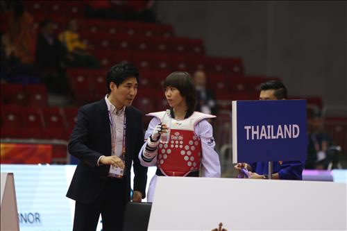| △ 정장 차림의 최영석 태국 대표팀 감독이 13일(현지시간) 러시아 첼랴빈스크에서 열린 2015 세계태권도선수권대회 여자 46㎏급 결승에서 파니파크 옹파타나키트에게 작전 지시를 하고 있다.<세계태권도연맹 제공> |