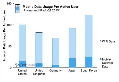 14일 모바일앱 분석 전문기업 앱애니가 발간한 '앱 고객 확보 인사이트: 2015년 1분기' 보고서에 따르면 올해 1분기 한국의 모바일 데이터 사용량 지수는 125로 비교 국가인 미국(100), 일본(90), 영국(80), 독일(70)을 크게 앞섰다.