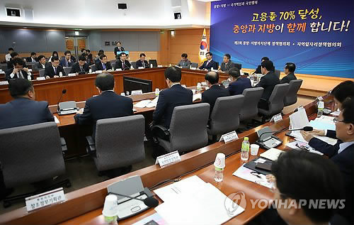 | △ 정종섭 행정차지부 장관(왼쪽에서 세번 째)과 이기권 고용노동부 장관(왼쪽 두번 째)이 지난 8일 서울 세종로 정부서울청사 별관에서 열린 제2회 중앙·지방자치단체 지역일자리 정책협의회에서 일자리 창출과 관련한 정책 창출에 관한 토의를 하고 있다. |