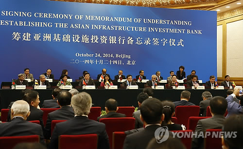 | △ 지난해 10월 베이징에서 열린 중국 아시아인프라투자은행(AIIB) 설립 양해각서 체결식 (EPA=연합뉴스 자료사진) |