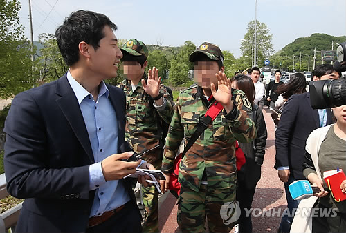 | △ 조기퇴소한 예비군에 쏟아지는 질문 (서울=연합뉴스) 임헌정 기자 = 총기사고가 난 서울 내곡동 예비군훈련장에 입소한 예비군 가운데 일부가 14일 부대 버스를 타고 서초구 헌인릉 인근 버스정류장에 내린 뒤 취재진의 질문세례를 받고 있다. |