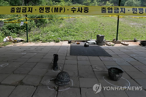 | △ '수사중' (서울=연합뉴스) 임헌정 기자 = 예비군 총기 난사 사건 발생 다음 날인 14일 오후 서울 내곡동 예비군훈련장 내 사고현장인 예비군사격장을 군 관계자가 공개하고 있다. |