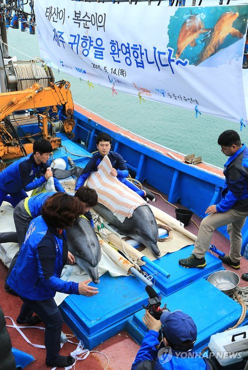 | △ 태산이·복순이 고향 바다로 (제주=연합뉴스) 변지철 기자 = 불법 포획돼 돌고래쇼에 동원됐다가 대법원에서 몰수가 확정된 국제보호종 남방큰돌고래 태산이와 복순이가 14일 어선에 태워져 오후 제주시 조천읍 함덕리 정주항의 해상 가두리로 옮겨지고 있다. 2015.5.14 bjc@yna.co.kr |