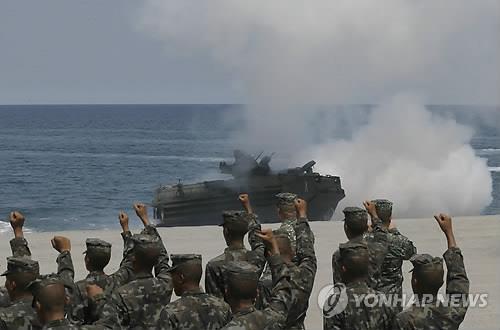 | △ (산안토니오<필리핀> AP=연합뉴스) 지난 4월 21일(현지시간) 필리핀 서부 잠발레스주의 산안토니오에 있는 해군교육훈련사령부에서 미군과 필리핀군이 중국과의 영유권 분쟁중인 스카보러섬(Scarborough Shoal, 중국명 황옌다오.黃巖島)을 겨냥해 벌인 합동상륙작전에서 필리핀 군인들이 미군 수륙양용장갑차(AAV)가 해안에 상륙하자 주먹 쥔 손을 들며 환호하고 있다. |