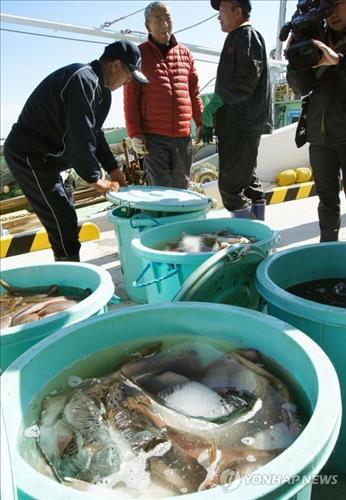 | △ 2013년 10월 일본 후쿠시마현 이와키지구 조합 어민이 잡아올린 수산물(교도.연합뉴스.자료사진) |