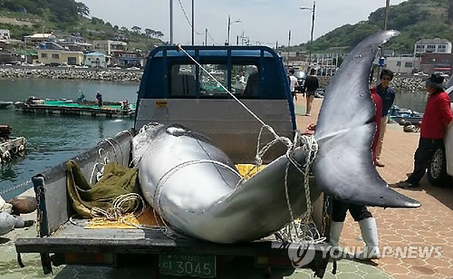 | △ 가덕도 해상서 잡힌 밍크고래 (창원=연합뉴스) 지난 17일 낮 부산시 강서구 가덕도 앞바다에서 그물에 잡힌 길이 4m 짜리 밍크고래. 2015.5.18 <<창원해양경비안전서>> seaman@yna.co.kr |