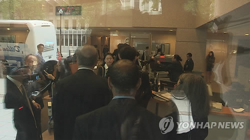 | △ 지난 15일 오전 8시께 론스타와 한국정부 사이에 무려 5조원대의 소송전이 열린 미국 워싱턴DC 세계은행 본부 산하 국제투자분쟁해결센터(ICSID). 양측 소송당사자와 대리인들이 건물 1층 보안검색대를 통과하고 있다. |