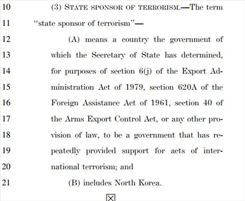 (워싱턴=연합뉴스) 노효동 특파원 = 미국 하원이 최근 통과시킨 내년도 국방수권법안의 특정 조항에서 북한을 테러지원국(State Sponsor of Terrorism)의 범주에 포함시킨 것으로 뒤늦게 확인됐다.