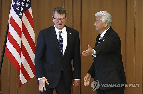 | △ 2015년 4월 8일 일본 도쿄도 소재 방위성에서 나카타니 겐(오른쪽) 일본 방위상이 손을 뻗어 애슈턴 카터 미국 국방장관을 안내하고 있다.(AP=연합뉴스 자료사진) |