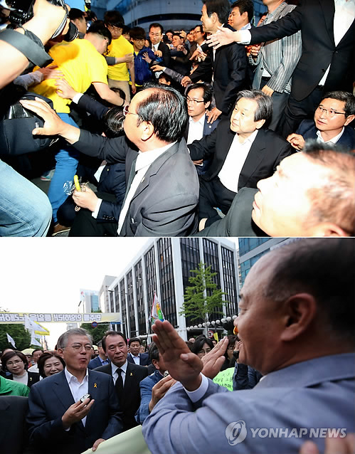 | △ 불청객 된 여야 대표 (광주=연합뉴스) 형민우 기자 = 새누리당 김무성 대표(위 사진)와 새정치민주연합 문재인 대표가 17일 오후 광주 동구 금남로에서 열린 5·18광주민주화운동 전야제에 참석했다가 광주 방문을 반대하는 시민들의 항의를 받고 있다. 김 대표는 결국 전야제 행사에 참석하지 못하고 자리를 떴으며 이 과정에서 취재진과 시민, 경찰 사이에서 몸싸움이 벌어지기도 했다. |