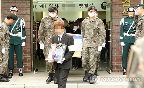 | △ "영원히 기억할게"…예비군 사망자 영결식 (성남=연합뉴스) 이우성 기자 = 서울 내곡동 예비군훈련장에서 발생한 총기난사 사건으로 숨진 예비군 영결식이 18일 오전 성남 국군수도병원 영결식장에서 육군 제52사단장으로 엄수되고 있다. |