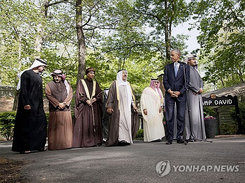 | △ (AP=연합뉴스) 버락 오바마 미국 대통령과 걸프협력회의(GCC) 6개국 정상 또는 대표들이 지난 14일 미국 메릴랜드 주 캠프 데이비드에서 회동한 뒤 결과 성명을 발표하려 하고 있다. |