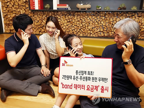 | △ SK텔레콤, '밴드 데이터 요금제' 출시 (서울=연합뉴스) SK텔레콤이 오는 20일 2만 원대 요금제부터 무선은 물론 유선 통화까지 무제한으로 쓸 수 있고 데이터를 자유롭게 활용할 수 있게 차별화한 '밴드 데이터 요금제'를 출시한다고 19일 밝혔다. 2015.5.19 << SKT 제공 >> photo@yna.co.kr |