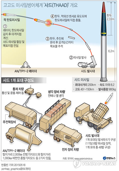 | △ <그래픽> 고고도 미사일방어체계 '사드(THAAD)' 개요 (서울=연합뉴스) 반종빈 기자 = 한국을 방문한 존 케리 미국 국무장관이 18일 고고도미사일방어체계(THAAD·사드)의 한반도 배치 필요성을 시사하는 발언을 해 주목된다. bjbin@yna.co.kr |