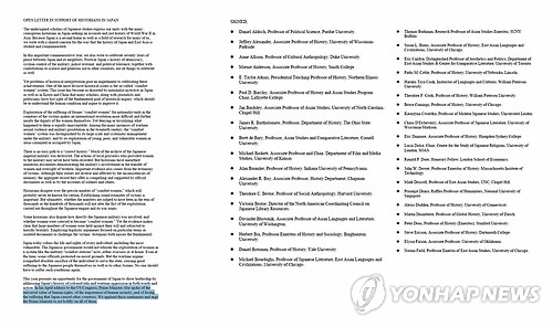 이에 앞서 미국과 유럽, 호주에서 활동 중인 일본학 전공 역사학자 187명은 지난 6일 '일본의 역사가들을 지지하는 공개서한'이라는 제목의 집단성명을 아베 총리에게 보낸 뒤 연합뉴스와 연합뉴스TV에 그 내용을 공개했다.