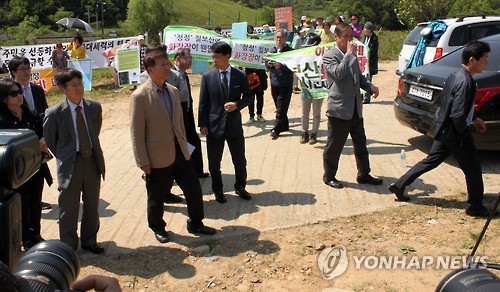 | △ 경기도 도시계획위원회, 화성화장장 현장조사 (화성=연합뉴스) 김인유 기자 = 20일 오후 경기도 도시계획위원회 위원들이 화성시 매송면 숙곡1리 화성광역화장장 예정지를 방문해 현장조사를 하고 있다. 이들 뒤로 화장장 건립을 반대하는 서수원 주민들이 현수막을 펼치고 "화장장 반대"를 주장하고 있다. 2015.5.20 hedgehog@yna.co.kr |