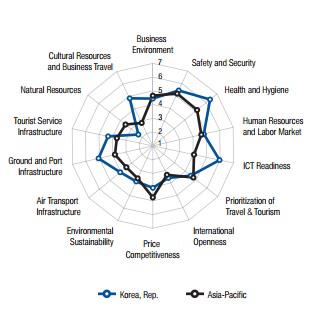 이번 결과는 WEF가 전 세계 141개국을 대상으로 ▲관광환경(비즈니스, 신변 안전, 보건·위생, 정보통신기술) ▲여행·관광정책(산업 민영화, 국제 개방, 가격경쟁력, 지속가능 환경) ▲인프라(공항, 육상·항만, 여행 서비스) ▲자원(자연환경,문화유적) 등 4개 범주의 90여 개 부문을 평가해 나온 것이다.