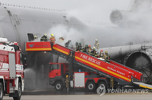 | △ 인천공항 소방훈련장에서 실시된 '항공기 사고 위기대응 종합훈련'(연합뉴스 자료사진) |