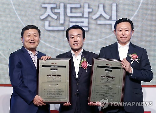 | △ 롯데, 창조적 노사문화 선포식 (서울=연합뉴스) 신동빈 롯데그룹 회장(오른쪽)이 21일 서울 잠실 롯데호텔에서 열린 '롯데 가족경영·상생경영 및 창조적 노사문화' 선포식에서 롯데월드 박동기 대표(왼쪽)와 롯데월드 노동조합 강석윤 위원장에게 노사헌장패를 전달한 후 기념사진을 촬영하고 있다. (롯데 정책본부 제공) |