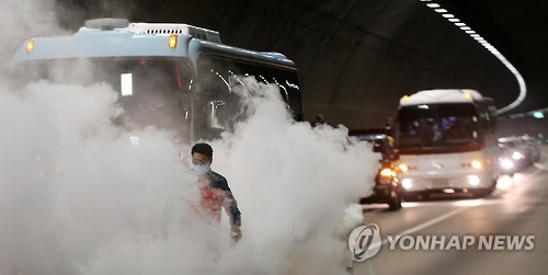 | △ "훈련 상황입니다" (용인=연합뉴스) 신영근 기자 = 21일 오후 경기도 용인 영동고속도로 마성터널에서 2015년 안전한국훈련의 일환으로 터널 내 교통사고로 발생한 가상 화재를 진화하는 훈련이 실시되고 있다. 2015.5.21 drops@yna.co.kr |